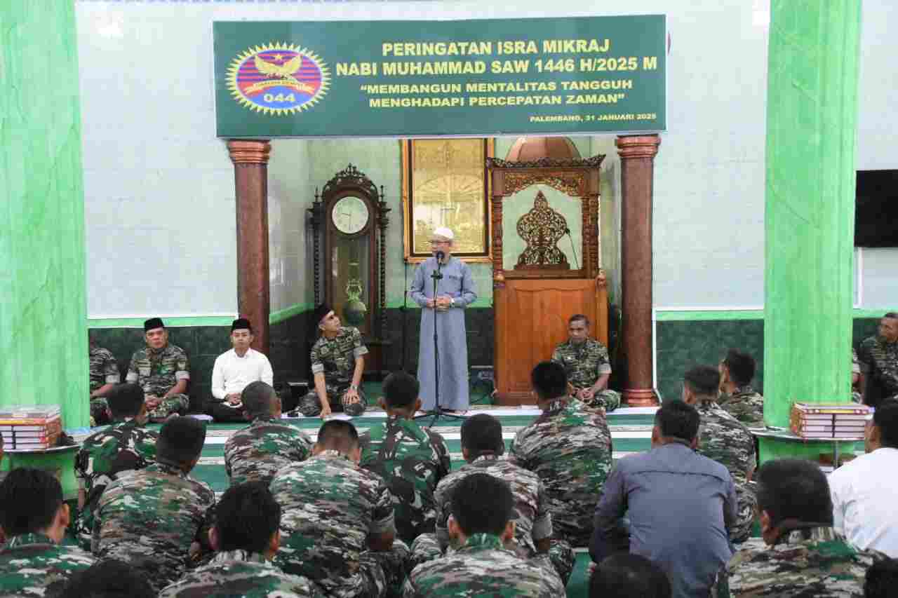 Palembang, MR – Mengangkat tema “Membangun Mentalitas Tangguh Menghadapi Percepatan Zaman”, Korem 044/Gapo menggelar peringatan Isra Mi’raj Nabi Muhammad SAW, bertempat di Masjid Al Ikhlas Makorem 044/Gapo Jl. Jenderal Sudirman Km. 4 Kota Palembang, Jumat (31/1/2025).