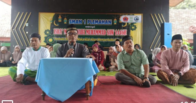 Dengan mengambil tema sangat menarik yaitu “Perbaiki Sholatmu Maka Allah Akan Memperbaiki Hidupmu” sehingga antusiasme murid, karyawan, dan Guru dalam mengikuti pengajian tersebut besar. Di kesempatan yang mulia tersebut Sekolah mengundang penceramah yaitu Kyai Aftom Baidlowi, penyampaiannya dengan khidmat, bahwa beribadah sholat dan makna-makna spiritualnya dari peristiwa Isra Miraj yang memiliki banyak pelajaran berharga bagi kita semua umat Islam, terutama bagi murid SMAN 1 Plemahan.