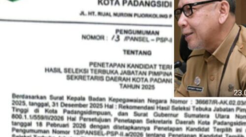 Padangsidimpuan, MR – Terkait Pengumuman tentang Penetapan Kandidat terpilih pada Seleksi Terbuka Jabatan Pimpinan Tinggi (JPT) Pratama Sekretaris Daerah Kota Padangsidimpuan tahun 2025 yang diduga telah terjadi diskriminasi dan persaingan tidak sehat, Ombusdman Sumut diminta agar turun tangan atas penetapan kandidat terpilihnya pada hasil seleksi terbuka JPT Pratama Sekda Kota Padangsidimpuan tahun 2025, demikian disampaikan Angga Oge di Padangsidimpuan, Jum’at 27/2/26. Dugaan diskriminasi tersebut berdasarkan surat pengumuman Panitia Seleksi (PANSEL) Pengisian JPT Pratama Sekda Kota Padangsidimpuan yang dua kali mengeluarkan surat pengumuman tentang penetapan kandidat terpilih seleksi pengisian JPT Pratama…