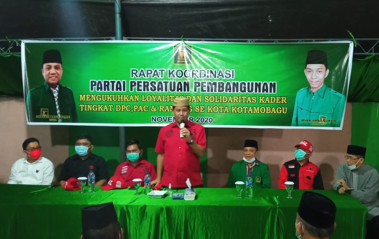 Dalam acara mengukuhkan loyalitas dan solidaritas kader PPP se-Kota Kotamobagu Wakil Gubernur Sulut memberikan pesan dimasa pilkada ini kita harus berjalan damai dan ikut mengamankan program program pemerintah pusat agar berjalan dengan lancar dan momentun konsolidasi ini dapat membuat Kader PPP selalu solid, loyalitas dan maju. (Neni)