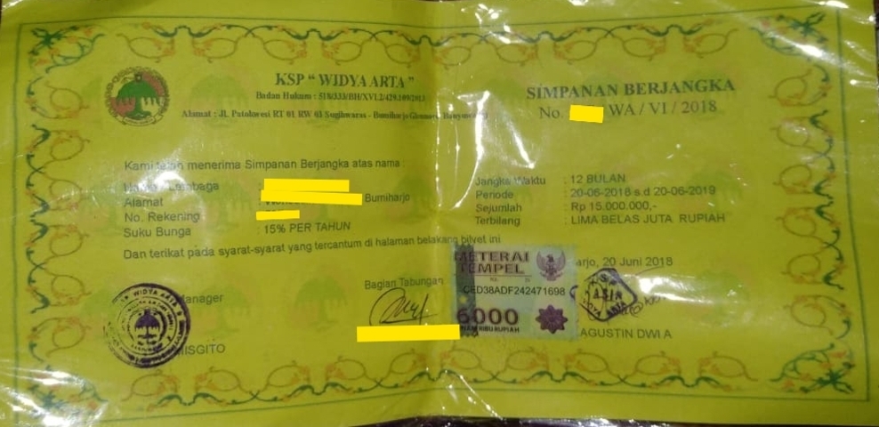 BANYUWANGI, Mediarakyatnews.com: Sedih dan bingung mungkin itu yang di rasakan puluhan anggota Ksp widya Arta yang berada didusun sugehwaras desa Bumiharjo kecamatan Glenmore karena dana diposito atau simpanan berjangkanya tidak dapat di cairkan