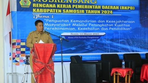 SAMOSIR, MR | Bupati Samosir Vandiko T. Gultom, ST secara resmi membuka Musyawarah Perencanaan Pembangunan (Musrenbang) Rencana Kerja Pemerintah Daerah (RKPD) Kabupaten Samosir Tahun 2024 di JTS Hotel Parbaba, Kecamatan Pangururan, Senin (13/3).