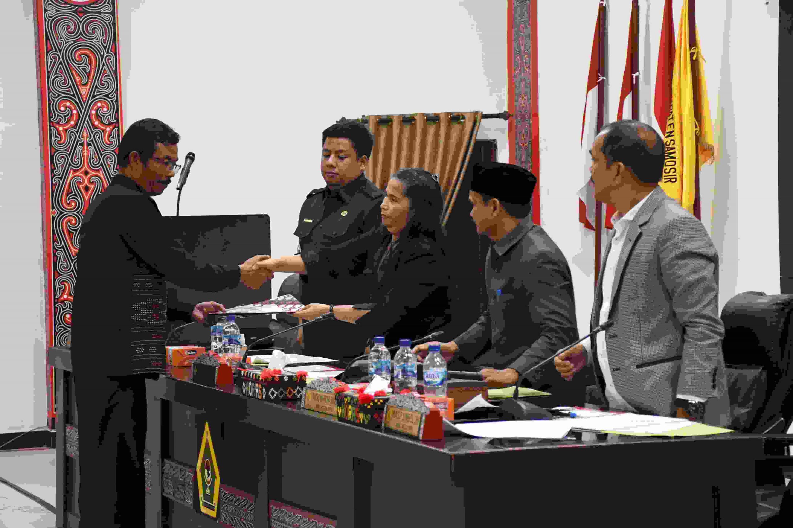 Persetujuan bersama ditandai dengan penandatangan oleh Bupati Samosir dengan Ketua DPRD, Sorta E. Siahaan, Wakil Ketua DPRD Pantas M. Siahaan dan Nasib Simbolon di Gedung DPRD Kabupaten Samosir, Kamis (22/11).