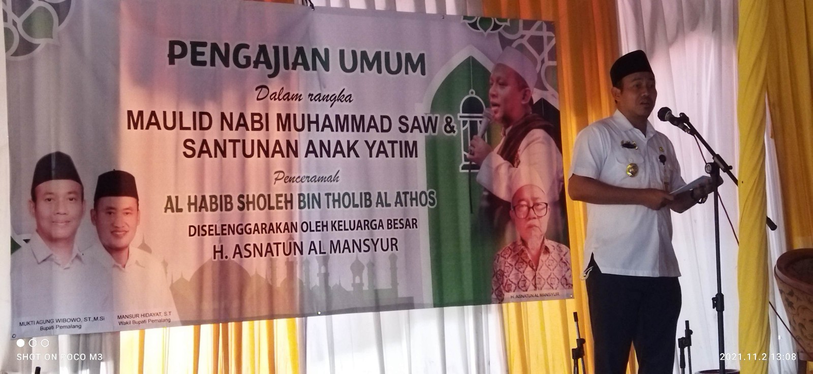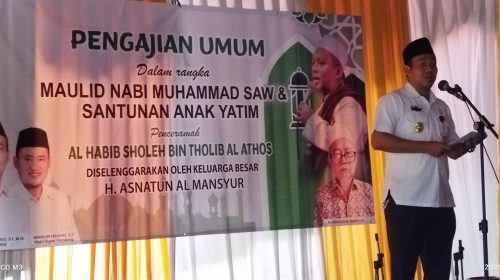 PEMALANG JATENG, [MR] – Dalam rangka memperingati Maulid Nabi Muhammad SAW, Haji Asnatun Al Mansyur yang sering disapa Haji Mansyur menggelar acara santunan untuk anak-anak yatim dihalaman rumahnya, Desa Mereng Kecamatan Warungpring, pada selasa [02\10].Turut hadir dalam acara tersebut, Bupati dan wakil bupati Pemalang, Agung Mansur dan para tamu undangan lainnya, serta hadir pula dari Forkompimca [Forum Komunikasi Pimpinan Kecamatan] Warungpring beserta beberapa Kepala Desa wilayah setempat.