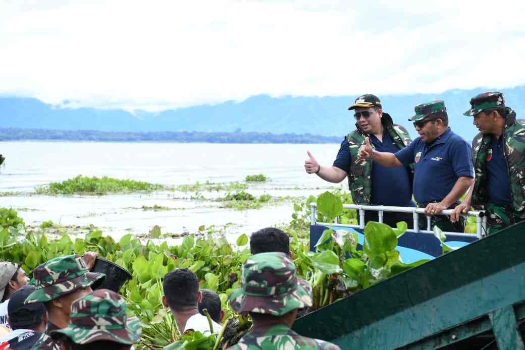 Pada kesempatan tersebut, Mayjen TNI Rio Firdianto bersama rombongan dan seluruh Bupati turut serta membersihkan langsung eceng gondok di perairan Pantai Landai, Desa Lumban Gaol.
