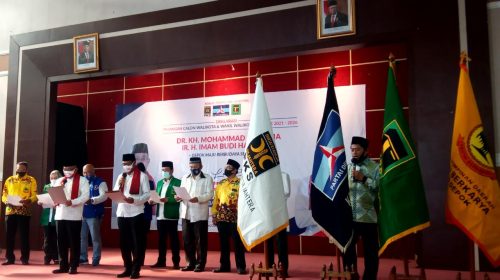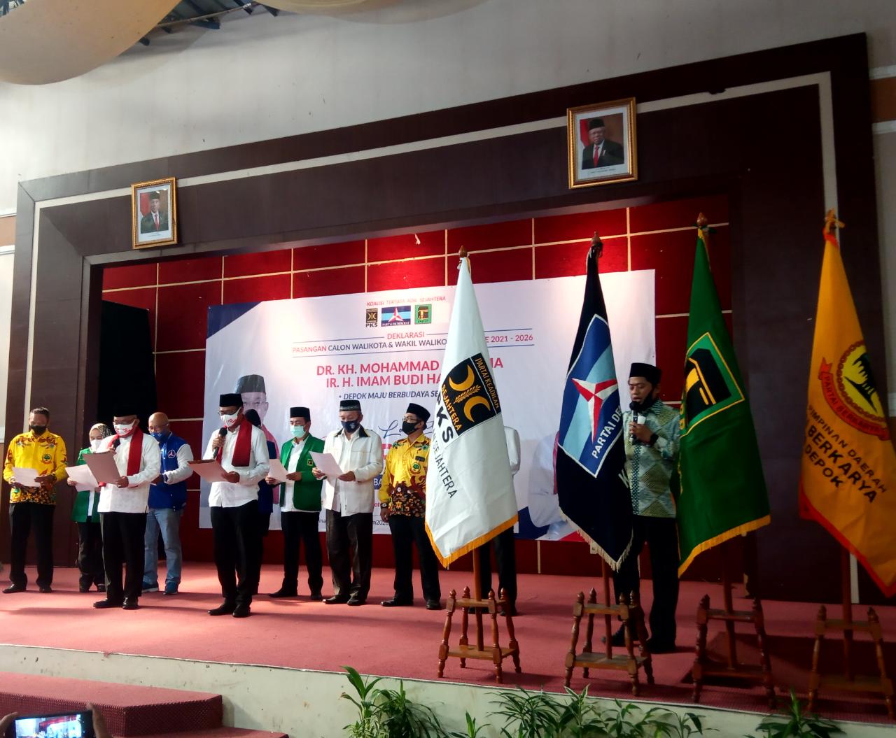 Depok | www.mediarakyatnews.com,- Deklarasi pasangan calon wali kota dan wakil wali kota Depok DR.KH. Mohammad Idris dan Ir. Imam Budi Hartono hari ini digelar di Hotel Bumi Wiyata, Depok, Jumat (4/9/2020). Pasangan yang membawa tagline “Bangun Depok Bersama” ini resmi diusung oleh tiga partai pengusung yaitu PKS, PPP dan Demokrat serta partai non parlemen lainnya yaitu Partai Berkarya. Gelaran Deklarasi ini juga turut dihadiri oleh para pimpinan partai, relawan kandidat, serta elemen tokoh, Serta Koalisi Ormas Depok (KODE), dan masyarakat Depok. Mohammad Idris yang merupakan Wali Kota Depok petahana ini menggandeng Imam Budi Hartono yang juga berpengalaman sebagai Anggota DPRD Jawa Barat dari Fraksi PKS. Pasangan IDRIS-IMAM dalam pidato politiknya menyampaikan akan mengusung Visi Depok yang Maju Berbudaya dan Sejahtera pada periode 2021-2026. “Saya Mohammad Idris bersama Imam Budi Hartono kami hadir membawa pengalaman, pengetahuan dan akumulasi jaringan untuk melanjutkan pembangunan di kota Depok yang maju berbudaya dan sejahtera, dengan ridho Allah SWT dan dukungan seluruh masyarakat Depok, kami memohon dukungan dan doa restu untuk kembali memimpin Depok 5 tahun kedepan” Ujar Idris.