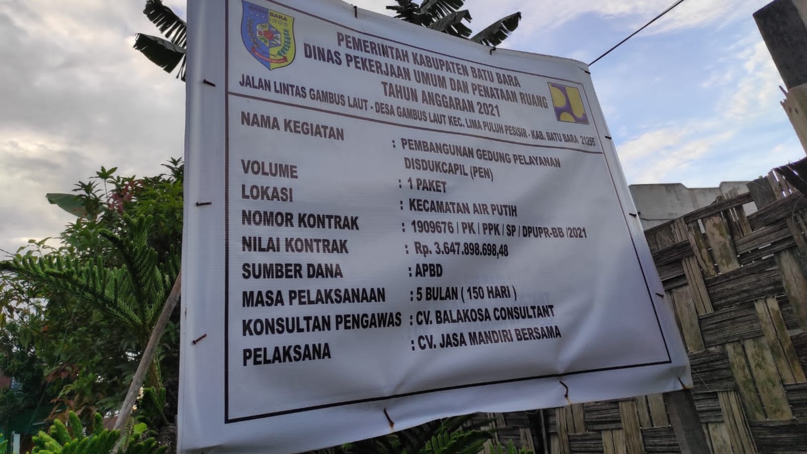 Pekerjaan yakni Pembangunan Gedung Pelayanan Disdukcapil kabupaten Batu Bara, Lokasi Kecamatan kecamatan Air Putih masa pelaksanaan 150 hari kalender dengan nomor kontrak 1909676/PK/PPK/SP/DPUPR/BB/2021 Pelaksana CV.Jasa Mandiri Bersama Nilai Kontrak Rp 3.647.898.698,48.