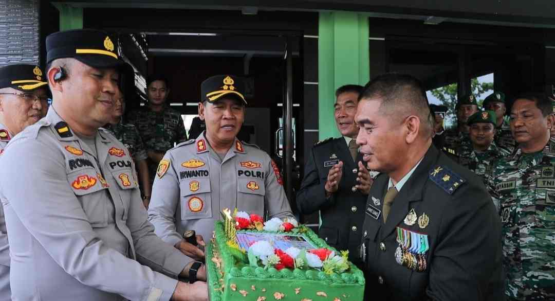 Kotamobagu, MR – Minggu 5 Oktober 2025 Kapolres Kotamobagu AKBP Irwanto, SIK,.MH beri kejutan dihari ulang tahun TNI ke-80 di Markas Kodim 13030 Bolmong berupa tumpeng dan kue ulang tahun.