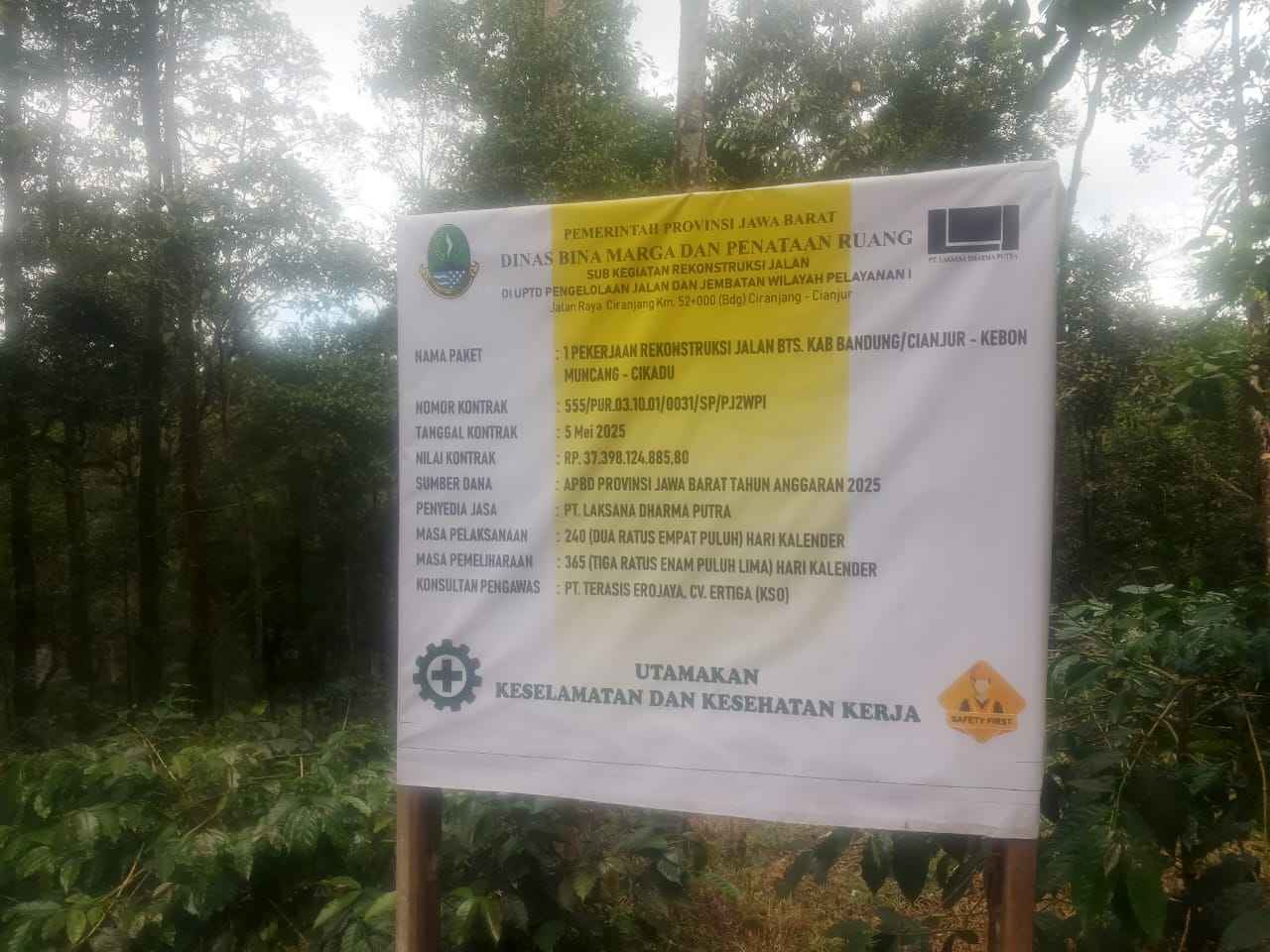 Proyek pekerjaan rekontruksi jalan batas Kab. Bandung/Cianjur-Kebon Muncang-Cikadu yang beranggaran sangat fantastis dengan nomor kontrak: 555/PUR.03.10.01/0031/SP/PJ2WPI. NILAI KONTRAK : Rp. 37.398.124.885,80. PENYEDIA JASA : PT. LAKSANA DHARMA PUTRA Tahun anggaran 2025.