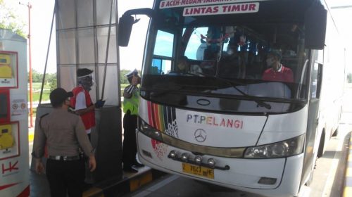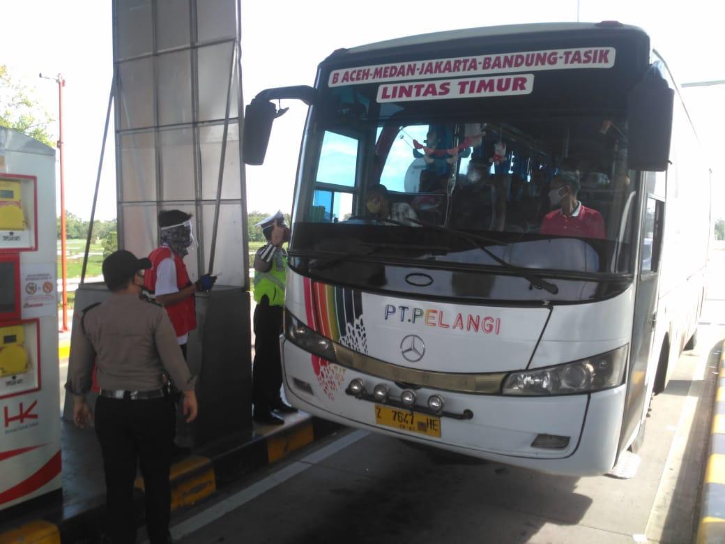 Kayuagung, (MR) – Petugas Pos Chek Poin Pengamananan Operasi Ketupat Musi 2020 Gerbang Tol Kayuagung bersama petugas dari Gugus Tugas Covid-19 Kabupaten OKI menghentikan bus Antar Kota antar Provinsi (AKAP) Pelangi asal Medan Sumatera Utara yang nekat mengantar penumpang dengan tujuan Pulau Jawa.