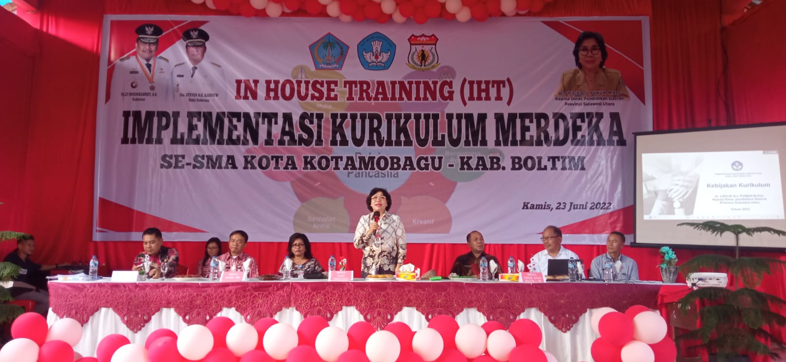 Kotamobagu, MR | Kamis 23 Juni 2022 – Kepala Dinas Pendidikan Provinsi Sulawesi Utara Dr. Liesje G.L Punuh, M.Kes,. membuka secara resmi In House Traning (IHT) serta Pelatihan Implementasi Kurikulum Merdeka (IKM) Se – SMA Kota Kotamobagu dan Kabupaten Bolaang Mongondow Timur (Boltim) yang bertempat di gedung Aula SMA N 1 Kotamobagu.