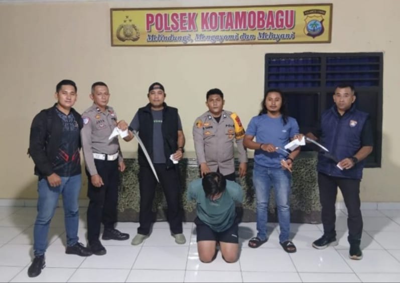 Seorang pria yang membuat keributan di wilayah Kelurahan Mogolaing berhasil diamankan bersama sejumlah barang bukti, termasuk tiga bilah senjata tajam