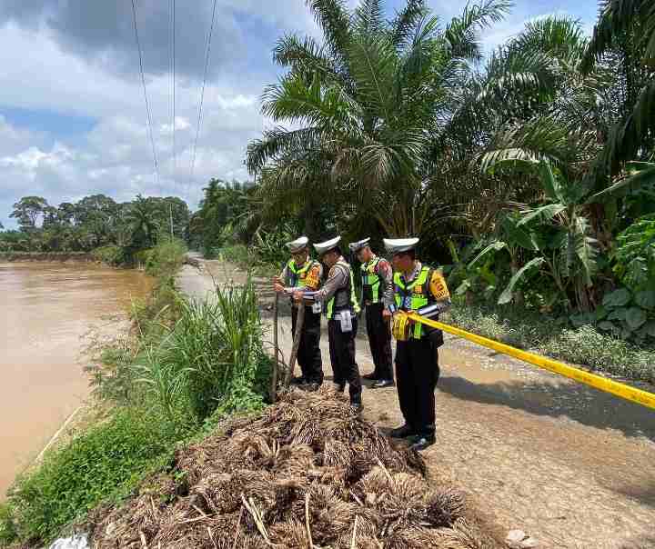 MURATARA, MR – Satlantas polres Musi Rawas Utara ,Polda Sumsel memasang police line di jalan longsor penghubung Kecamatan Karang Dapo dengan Kecamatan Rawas Ilir, kabupaten Musi Rawas Utara, (7/2/2026).