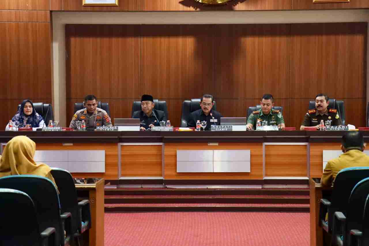 Rakor ini dipimpin langsung oleh Pj. Bupati Ciamis H. Engkus Sutisna. Sementara Kapolres Ciamis Polda Jabar hadir duduk deretan meja Pj. Bupati Ciamis bersama unsur Forkopimda Kabupaten Ciamis.