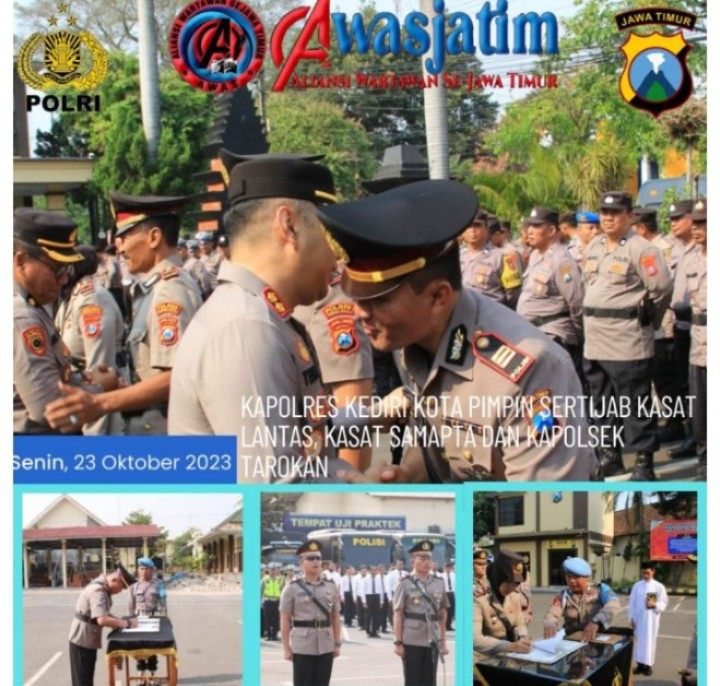 Kediri, (MR) – POLRES Kediri Kota menggelar serah terima jabatan Kasat Lantas, Kasat Samapta dan Kapolsek Tarokan, Senin (23/10). Kegiatan digelar di halaman Mapolres Kediri Kota Jl KDP Slamet 02 Kota Kediri.