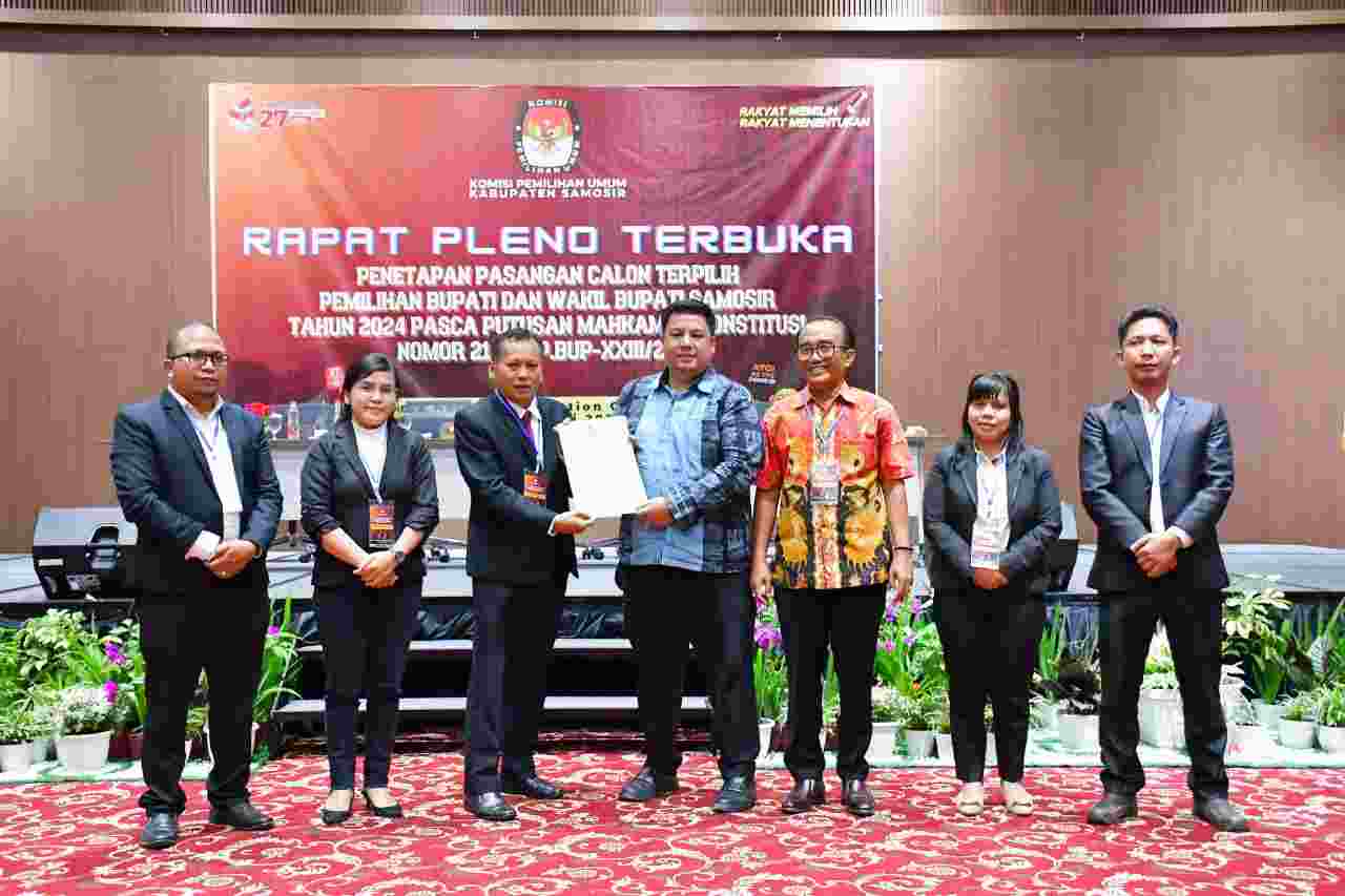 Penetapan calon terpilih tertuang dalam Berita acara nomor 9/PL.02.7-BA/1217/2/2025 tentang Rapat Pleno Terbuka Penetapan Pasangan Calon Bupati dan Wakil Bupati Terpilih dalam pemilihan Bupati dan Wakil Bupati Kabupaten Samosir Tahun 2024 dan Surat Keputusan KPU Kabupaten Samosir Nomor 6 tahun 2025 tepat pukul 16.02 Wib.