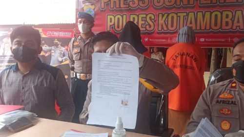 Kotamobagu, MR | Polres Kotamobagu Rabu 25 Mei 2022 menggelar Press Conference terkait kasus investasi bodong berkedok arisan yang di lakukan Owner KM alis Kof, 2 (dua) admin AD dan IM.