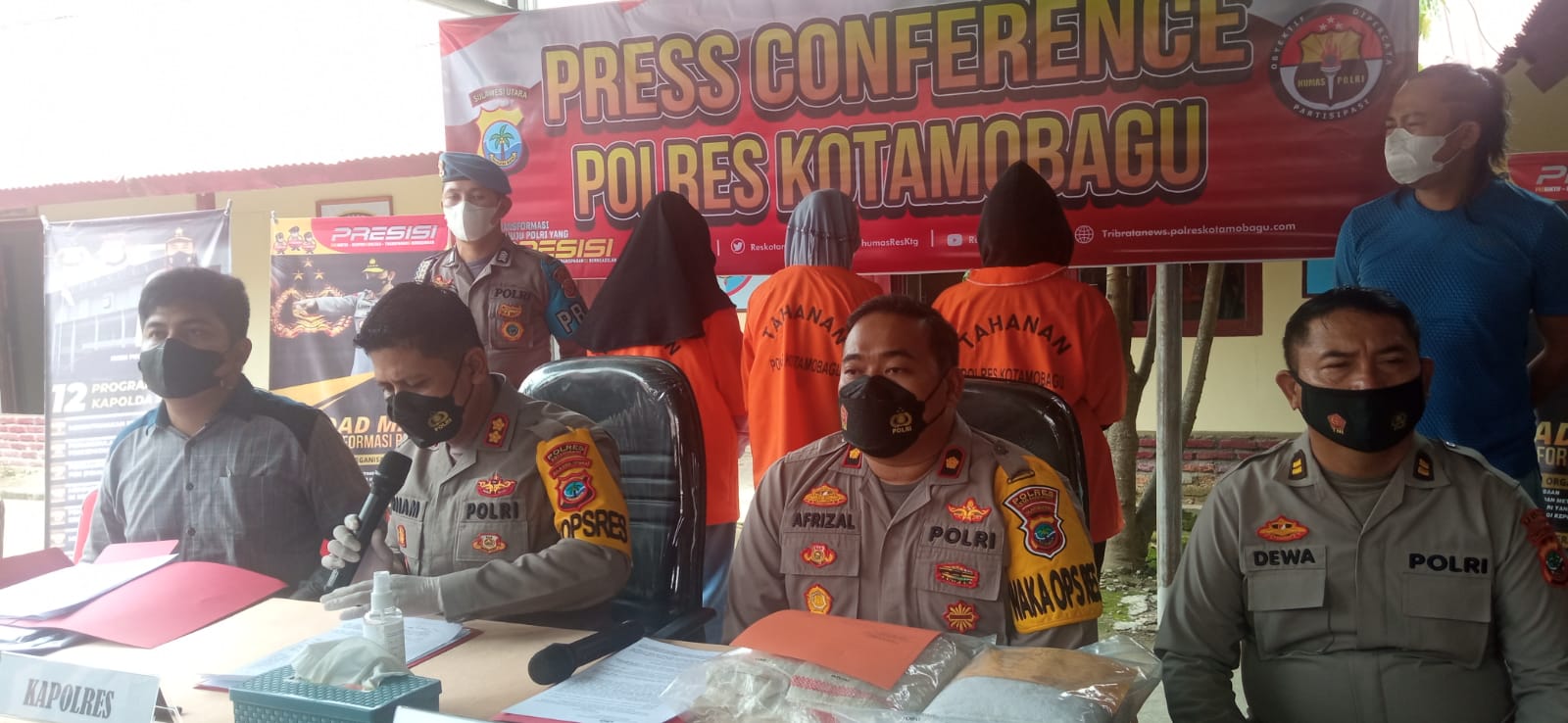 Dalam Press Conference, Kapolres turut didampingi Wakapolres, Kasat Reskrim dan Kasi Humas Polres Kotamobagu di halaman Polres.
