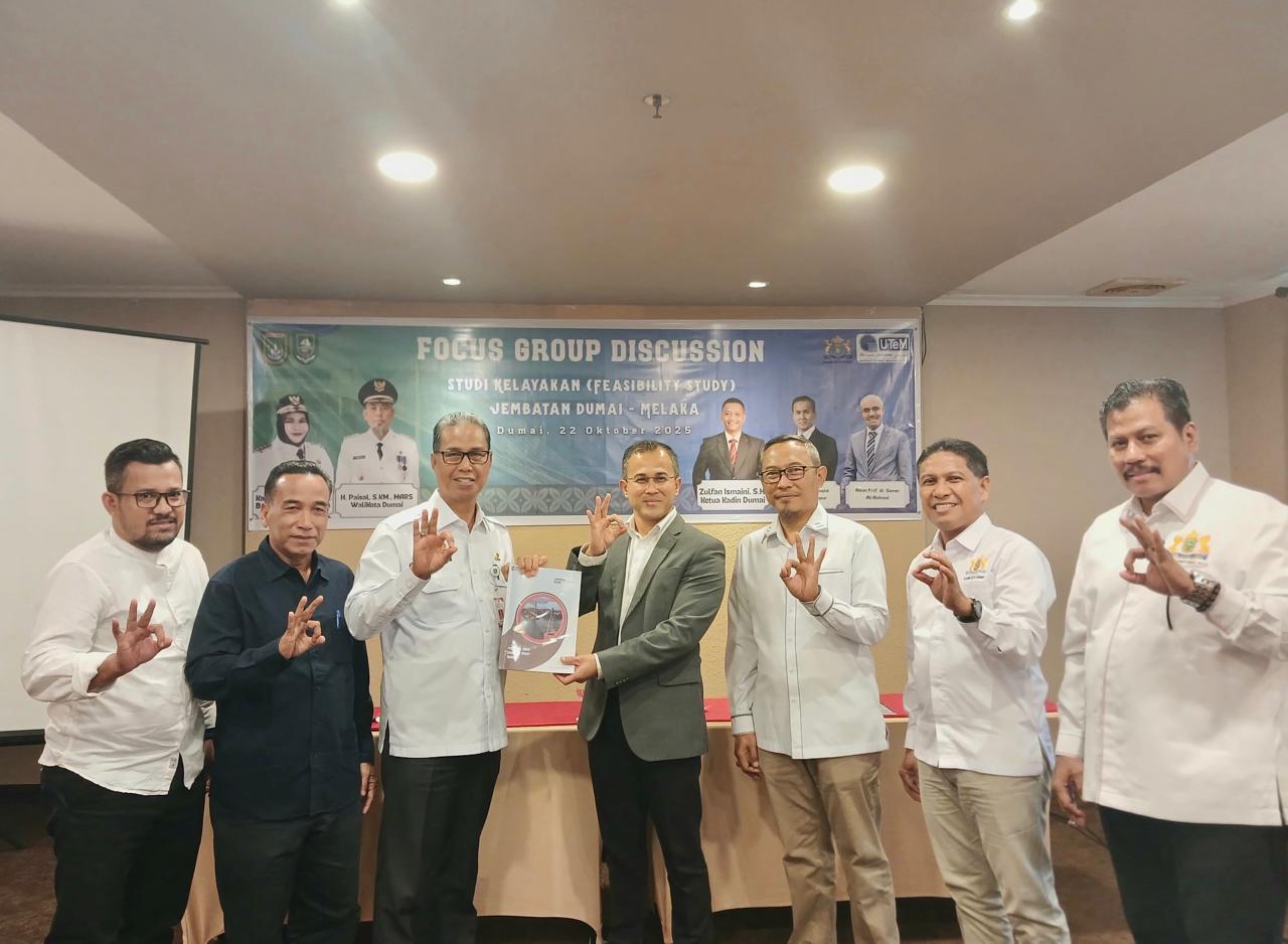 DUMAI, MR – Bupati Bengkalis melalui Asisten Perekonomian dan Pembangunan Sekretariat Daerah Kabupaten Bengkalis, Toharudin, menghadiri sekaligus ikut menandatangani Berita Acara Focus Group Discussion (FGD) dalam rangka penyusunan Feasibility Study (Studi Kelayakan) pembangunan Jembatan Dumai–Melaka, Rabu (22/10/2025), bertempat di Ballroom Hotel Grand Zuri Dumai.