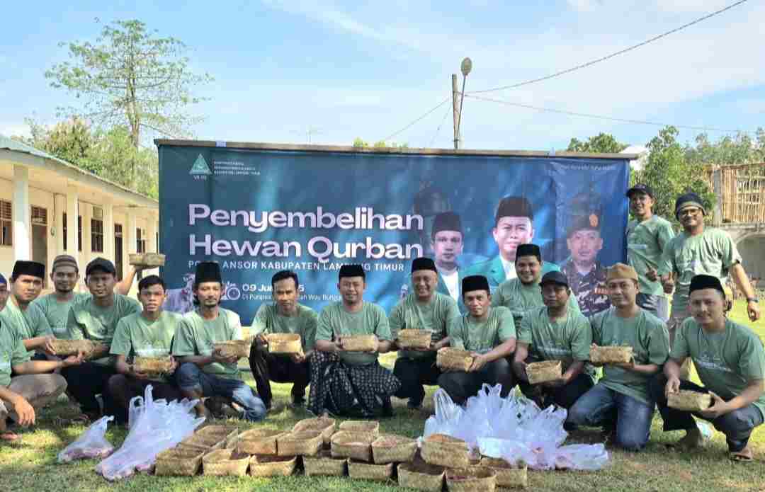 Lampung Timur, MR – Momen Hari Raya Idhul Adha Adalah Momen untuk membangun semangat berjuang, Berbagi dan Menata diri, demikian pernyataan Ketua PC GP Ansor Kabupaten Lampung Timur H.M.Muslih seusai melakukan penyembelihan Hewan Qurban di Ponpes Darul Fattah Way Bungur senin 9 Juni 2025.Menurut Aktifis Muda NU Lamtim itu bahwa organisasi yang ia pimpin selama ini selalu rutin melakukan penyembelihan hewan Qurban pada setiap hari Raya Idhul Adha dan Pada Tahun ini GP Ansor Kabupaten Lampung Timur melakukan penyembelihan Hewan qurban berupa 1 ekor sapi dan 18 ekor Kambing, 1 ekor sapi di laksanakan di tingkat Pengurus Pimpinan Cabang /Kabupaten dan 18 ekor kambing di laksanakan oleh masing masing pengurus Pimpinan anak Cabang/ Kecamatan sekabupaten Lampung Timur