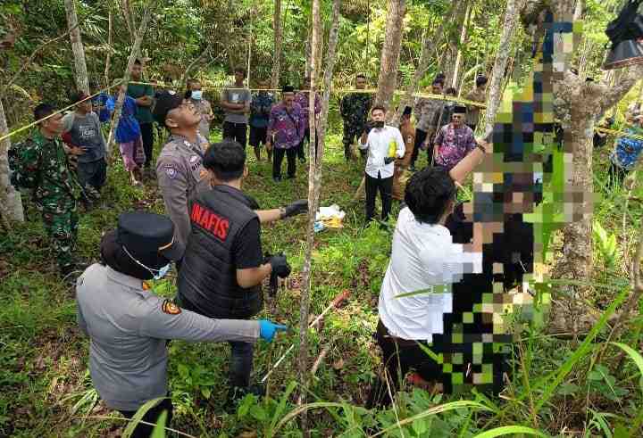 Di TKP, tim polisi melakukan olah TKP secara menyeluruh. Korban ditemukan dalam posisi leher terikat tali kain berwarna biru, dalam keadaan sudah meninggal sekitar 8 jam. Tidak ditemukan tanda-tanda penganiayaan atau kekerasan di tubuhnya.