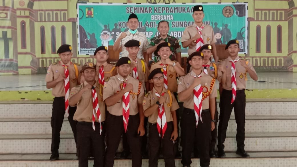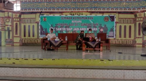 Sugai lilin, (MR) – Danramil 401-01/sungai lilin berikan materi wawasan Kebangsaan (wasbang) kepada santri pondok pesantren Assalam Al-Islami beralamat di Jl. Raya palembang-jambi sri gunung kecamatan sungai lilin kabupaten musi banyuasin (kab.muba) dalam acara Seminar kepramukaan dengan tema santri siap jadi abdi Negara, kamis (24/02/2022),.acara tersebut dihadiri Danramil 401-01/sungai lilin kapten Arm Indrajaya, didampingi Babinsa koramil 401-01/sungai lilin serda saragih, kepala pembina ponpres ustad Dian Bagus Ariwibowo A. Ma ustad Maman Sulaiman Lc. Ma dan diikuti 400 peserta pramuka,.
